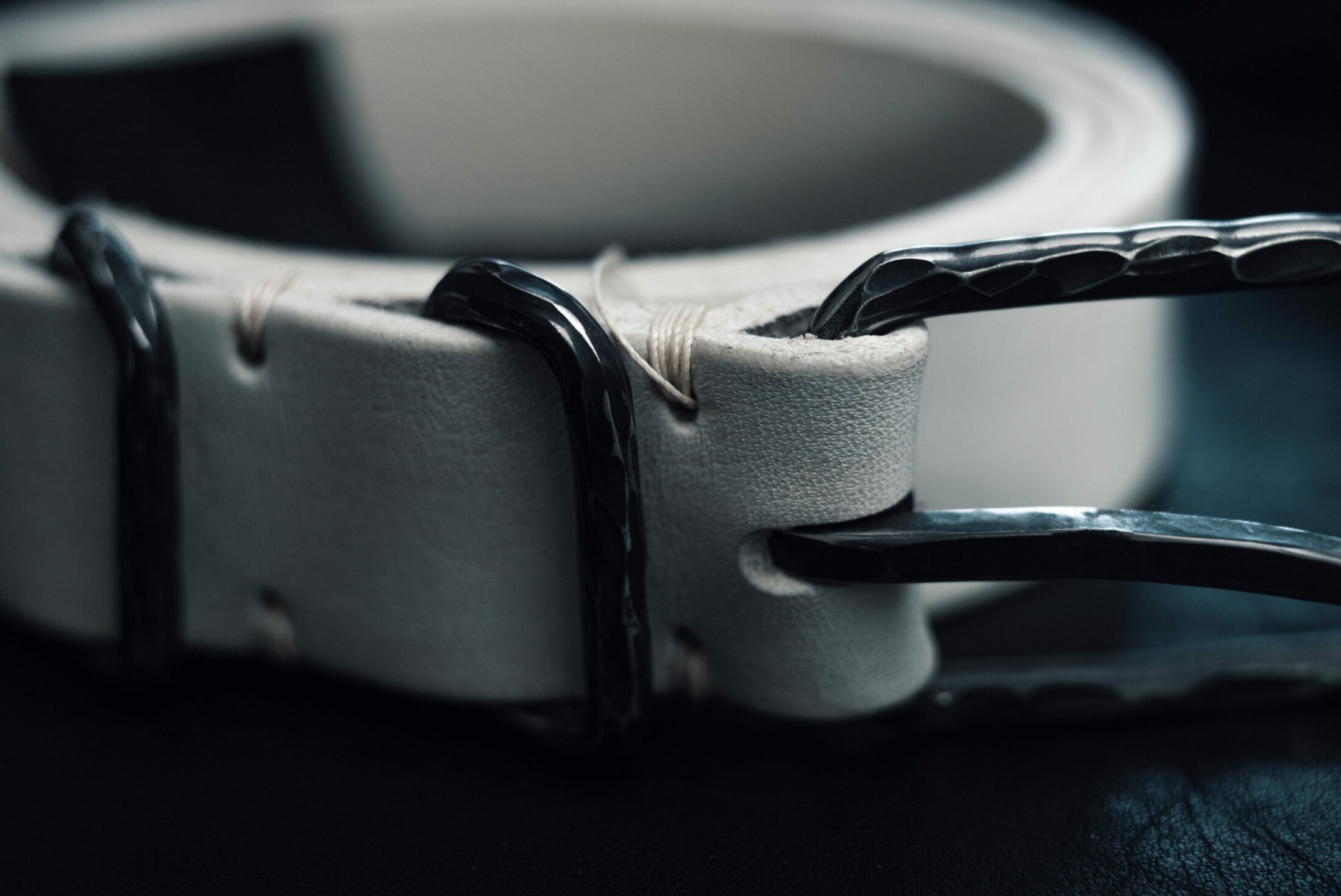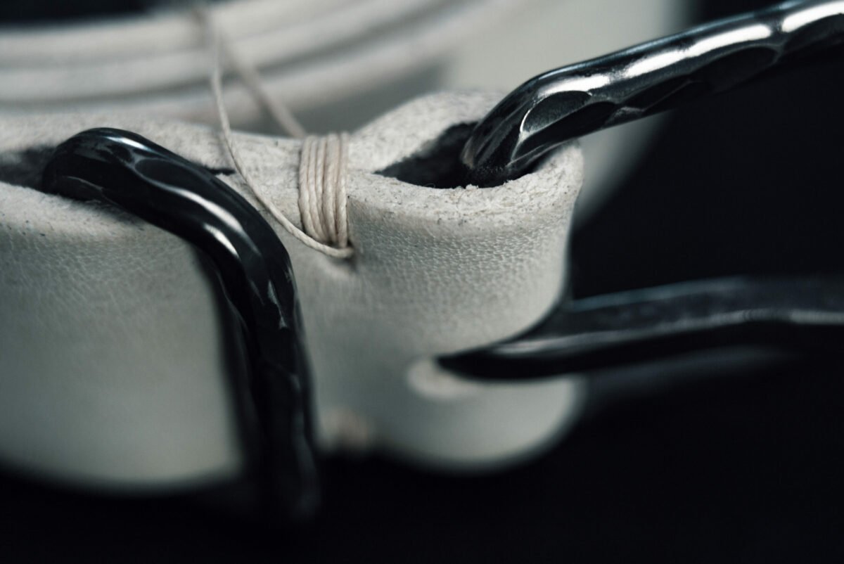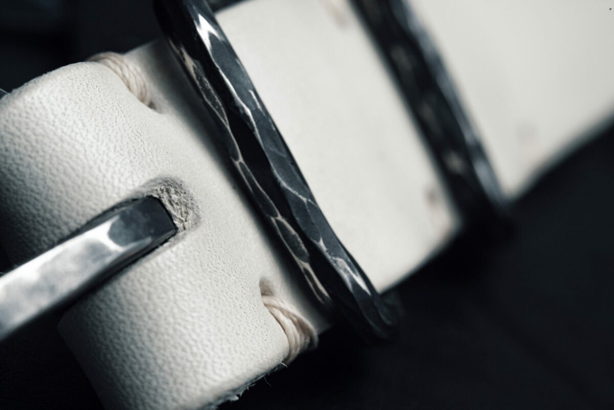 The Gary Girin “Albino” White metal-free bull leather and hammered steel. Also available in 925 silver instead of steel. French linen thread. Handmade in Moscow.