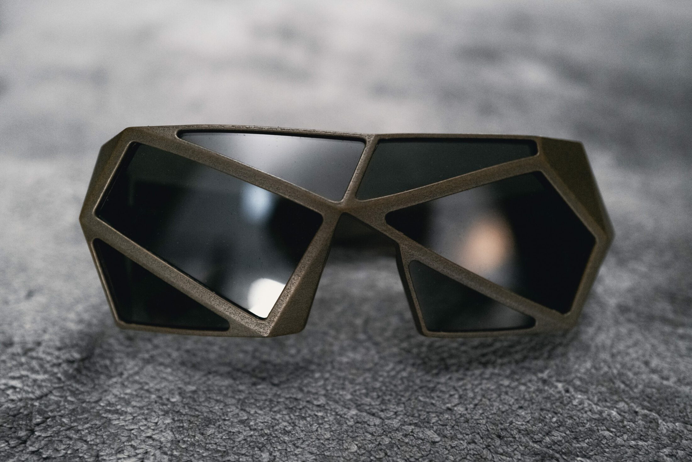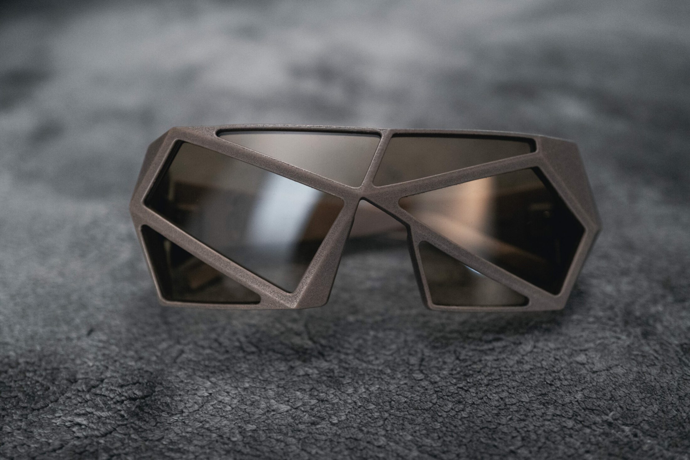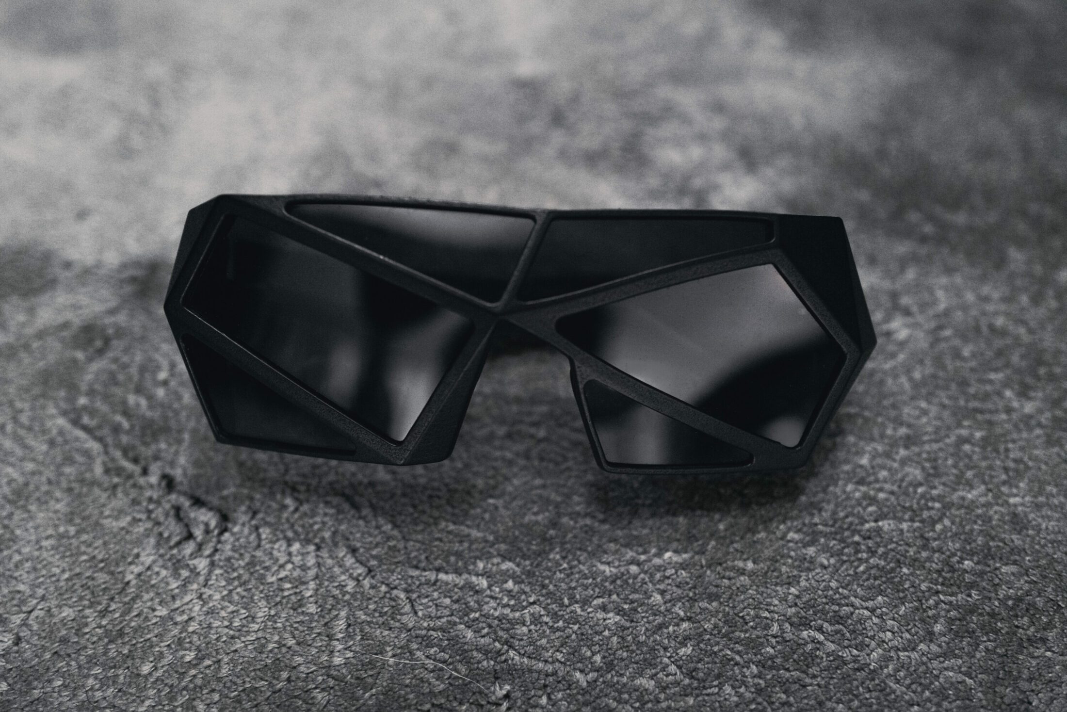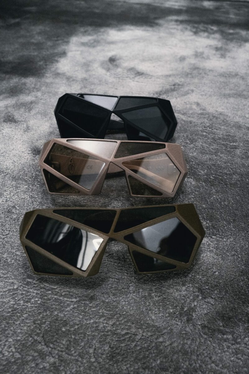 The first ever made sunglasses by Leon Emanuel Blanck are made of nylon, which makes them lightweight. The design is cutting-edge futuristic avant garde, one of a kind. Available in three different colors: military (green) nylon + dark green lenses, natural (skin tone) nylon + light brown lenses, all black – black nylon and black lenses.