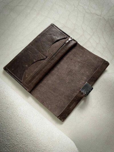 Long wallet. One piece construction. 1 compartment for banknotes, 1 zip pocket, 2 compartments for cards.